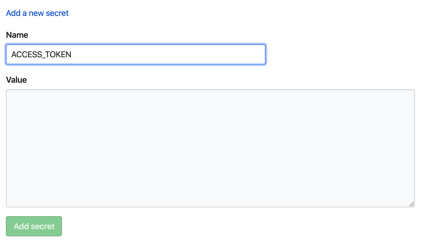 Settings page of your fork of the publish-RepoSense repo.Secrets menu item on the left of that page.Add secret.ACCESS_TOKEN or DEPLOY_KEY (depending on your earlier choice) and the value of the token/key you copied earlier.