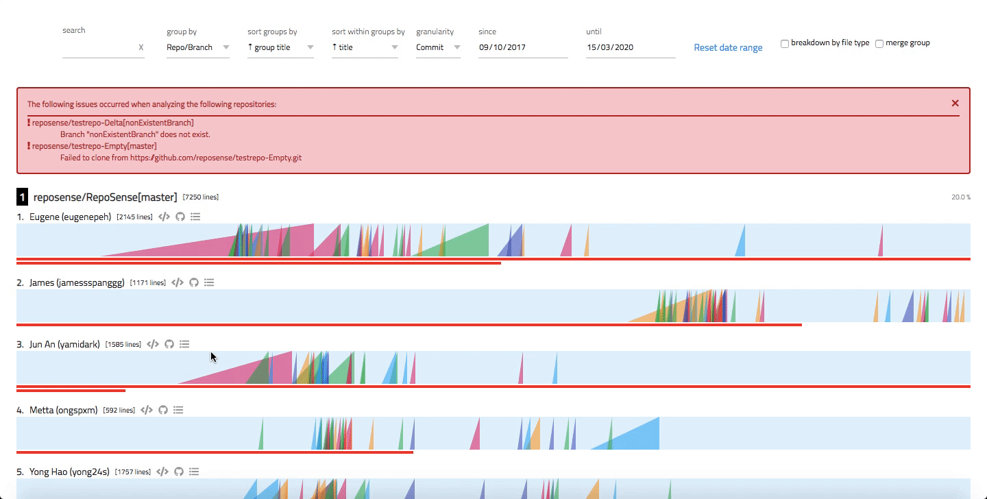 --view option:java -jar RepoSense.jar --view REPORT_FOLDERjava -jar RepoSense.jar --view ./myReport/reposense-reportindex.html (in the unzipped report directory) using a browser.choose file button in the shown web page, and select the archive.zip (in the same directory) manually.choose file button is not showing up, try a different browser.Here is an example of how a typical report looks like: