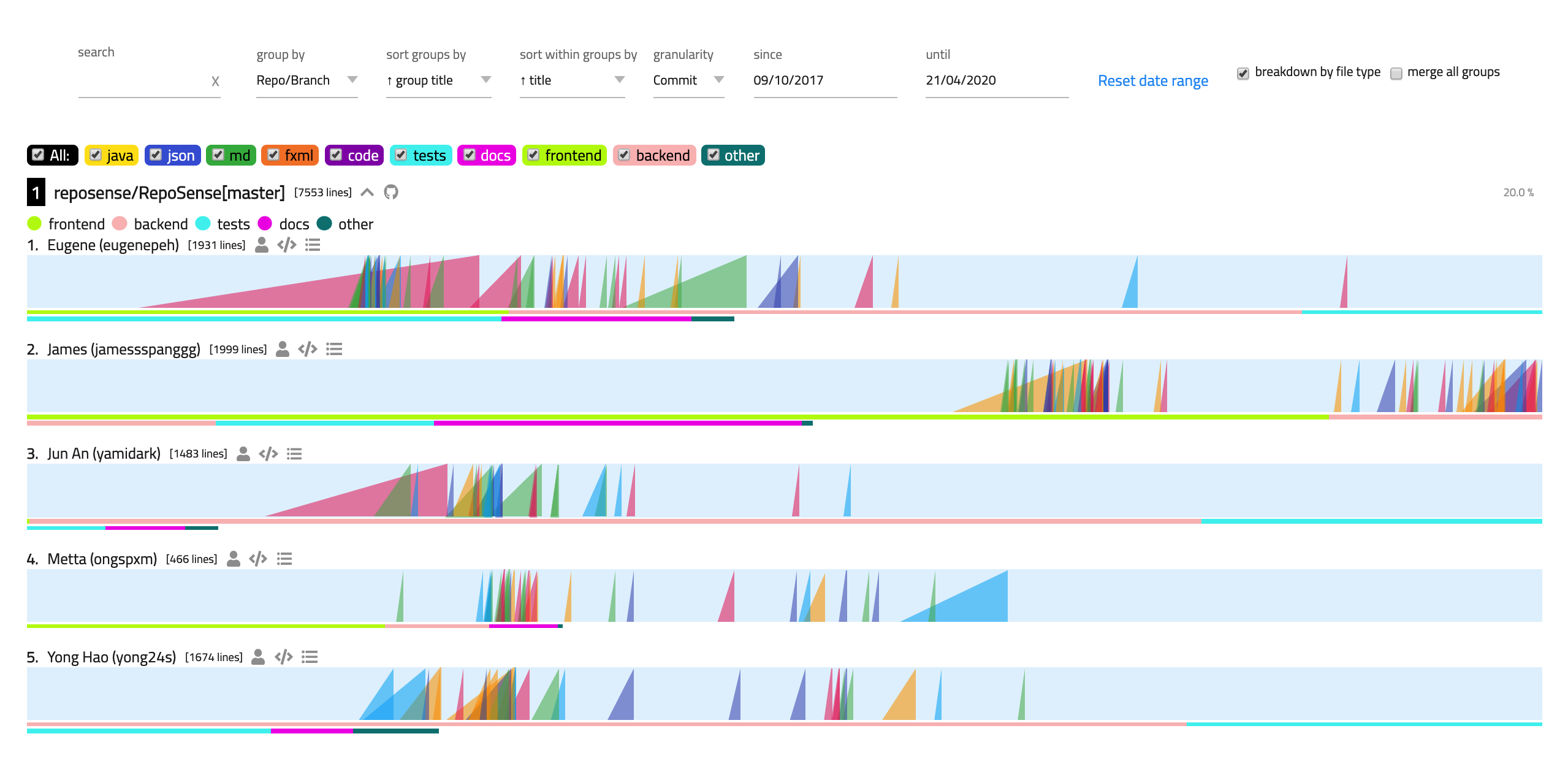 Commit: each commit made is shown as one ramp.Day: commits within a day (commits made within 00:00 to 23:59) are shown as one ramp.Week: commits within a week (from Monday 00:00 to Sunday 23:59) are shown as one ramp.Since, Until: the date range for the Ramp Chart (not applied to the Contribution Bars).Reset date range: resets the date range of the Ramp Chart to the default date range.Breakdown by file type: toggles the contribution bar to either display the bar by :