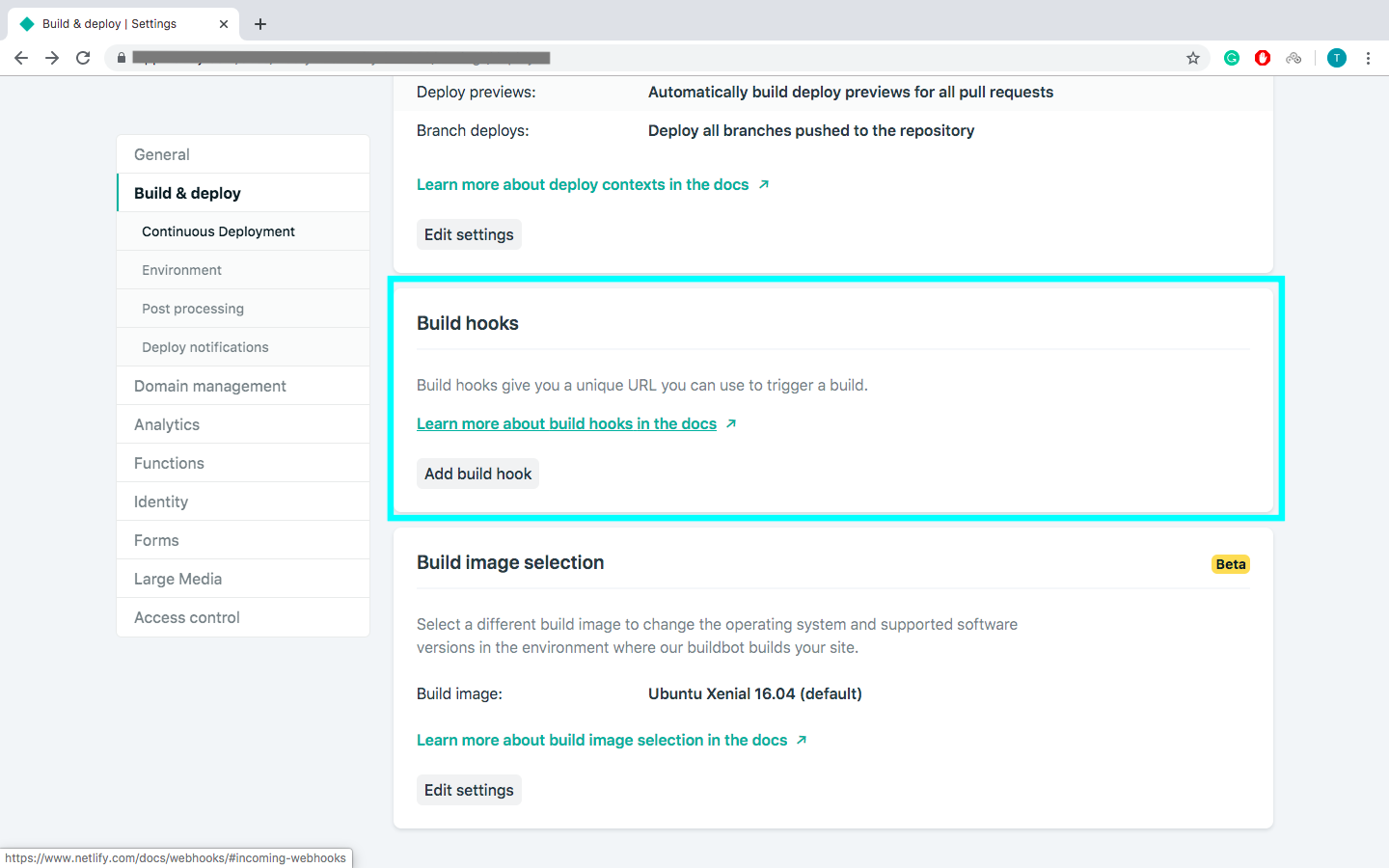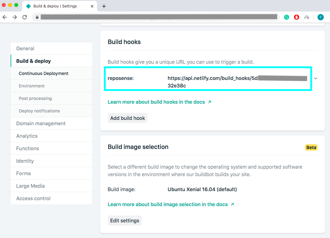 Click Add build hook, give your webhook a name, and choose the master branch to build. A Netlify URL will be generated.